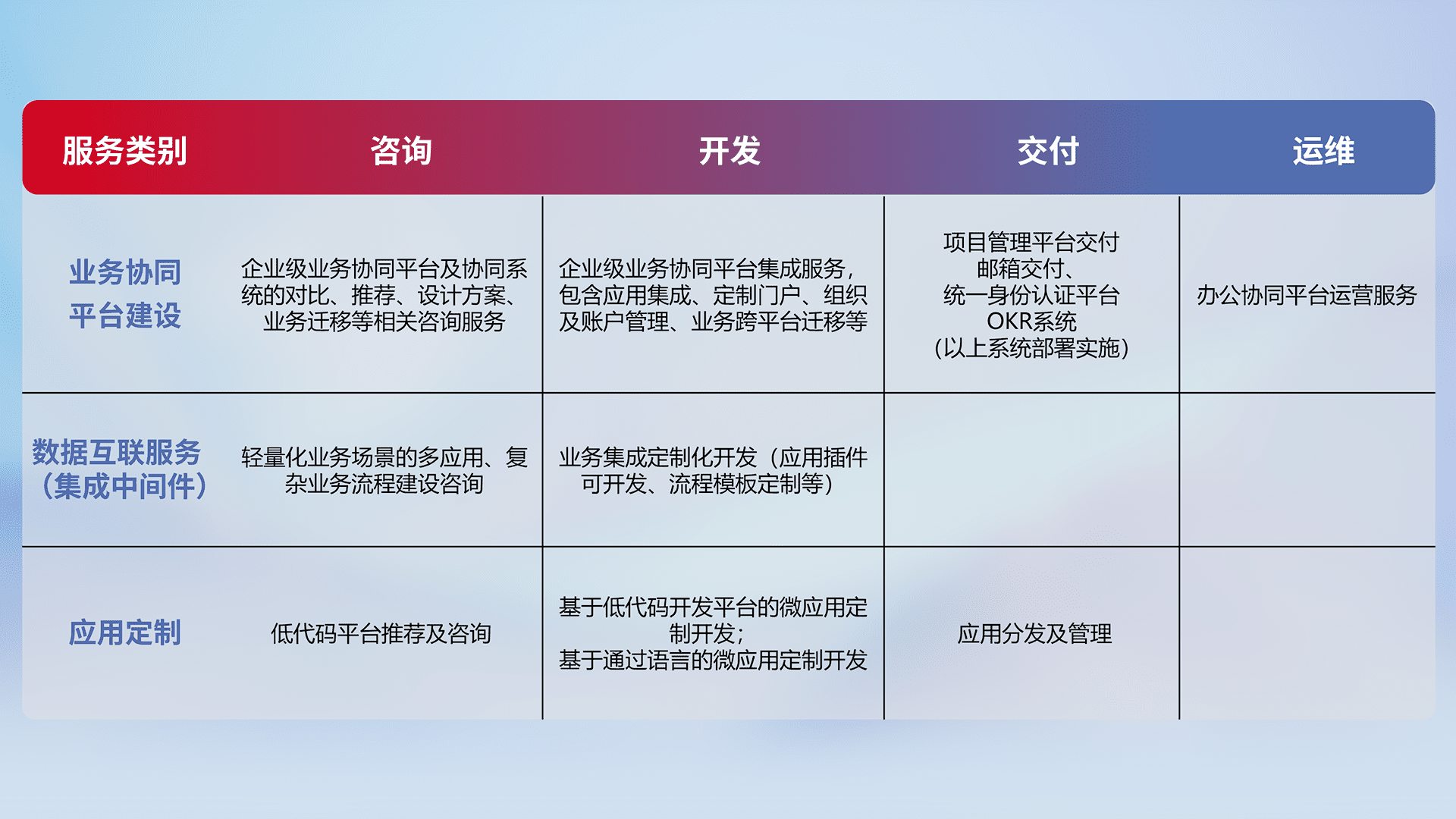 针对钉钉、、企微、、、IDaas等平台级产品提供产品的规划、、方案、、、、交付、、定制化开发等服务,,实现如统一协同办公、、、智能客户服务、、混合会议管理、、智能数据查询、、、、等业务场景,,实现数字化转型。。。