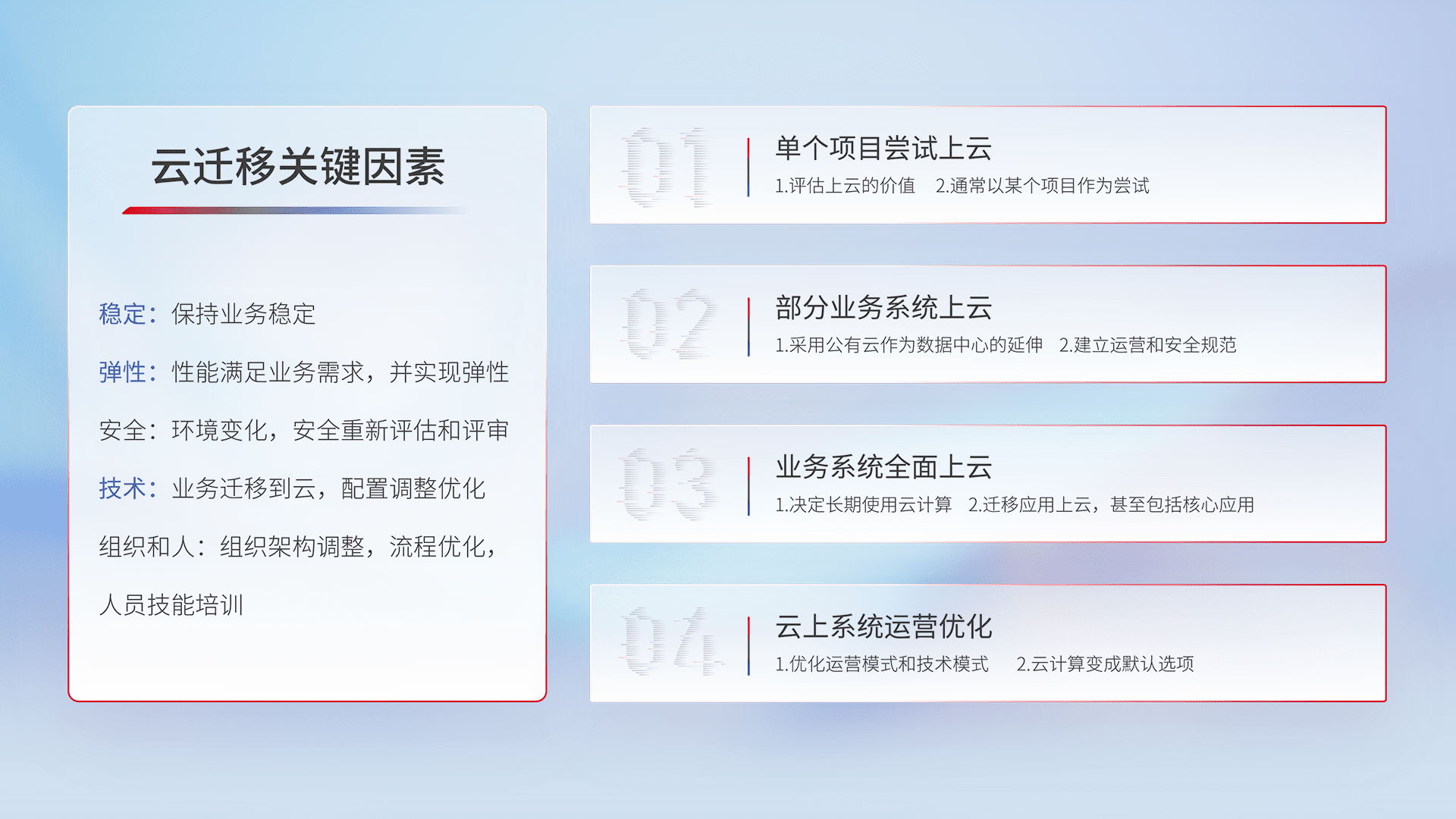 结合实际业务,,,,从规划设计、、、云平台选型、、、云原生改造、、、、数据迁移、、、、集成交付,,,迁移全过程为客户识别最佳上云路径,,做好风险识别管理,,设计网络架构、、身份权限、、安全审计合规、、、操作审计、、日志审计、、、、监控告警策略、、多站点容灾设计等,,,对云上基础设施进行整体规划,,,提升IT治理水平,,以满足弹性、、、高可用、、、高性能的需求。。