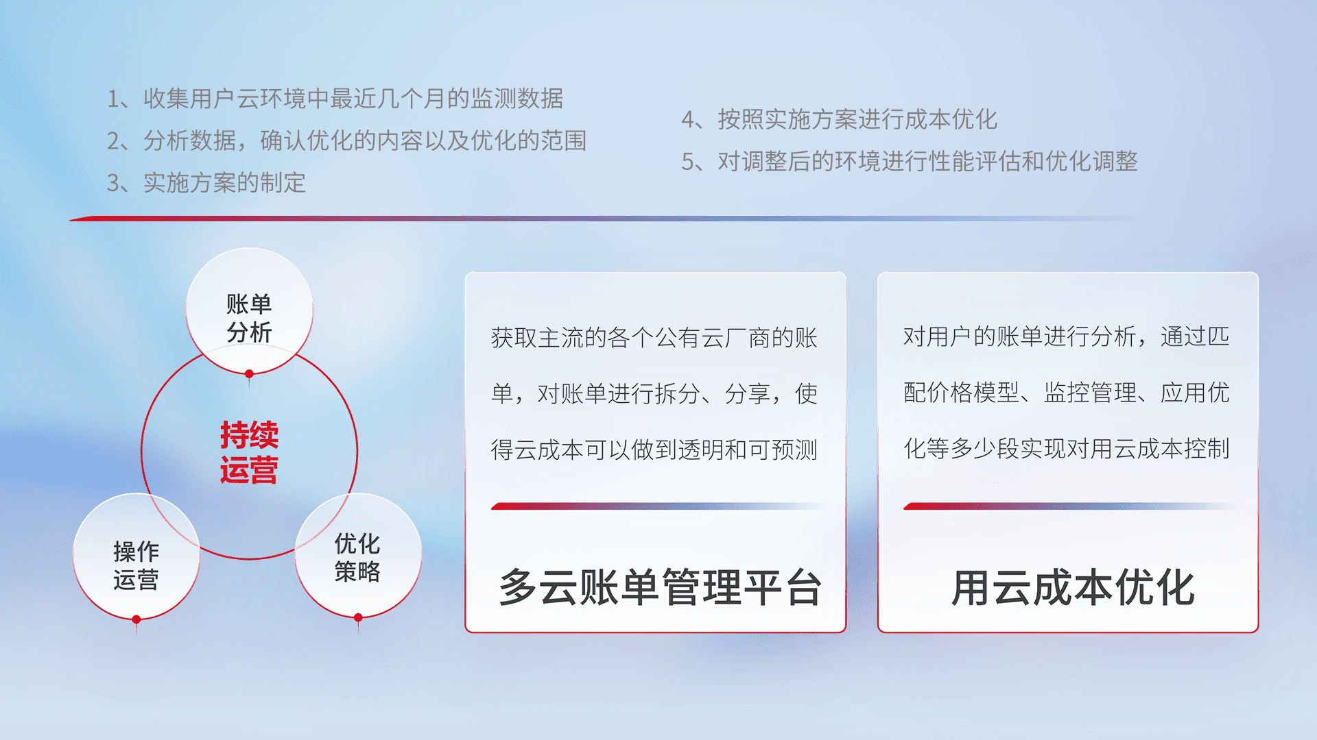 通过多云纳管,,以统一的资源数据模型把客户的云资源进行抽象和封装,,进而实现对多云资源的统一操作,,,保障云资源管理的可靠性、、、、稳定性与可用性。。。。量身定制化运维内容,,配置、、、开发运维、、补丁管理、、、、备份、、、、监控、、认证和访问管理、、审计和日常巡检等,,保障在用云过程中的可靠度,,稳定度以及高可用率。。